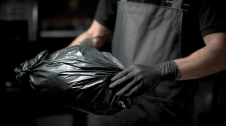 A focused individual in gloves and an apron handles a black garbage bag, emphasizing professionalism in waste disposal within a dark environment.