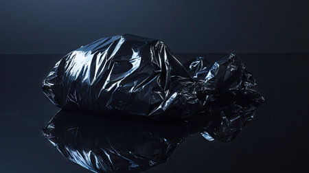 A shiny black plastic bag lying flat on a reflective surface under artificial lighting