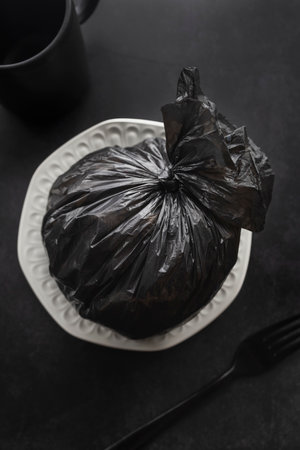 close up of used black plastic disposable bag on gray background