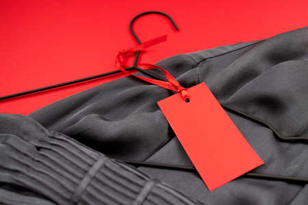 Mockup, empty red label for text on a drawstring lies on a gray silk shirt, black hanger. Close-up, label template design, print presentation mockup. Flat lay, top view. Red, contrasting background