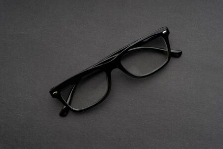 Classic black glasses on a dark gray background. Accessories for improving vision. flat lay.