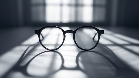 A pair of eyeglasses sits on a surface, casting interesting shadows created by the sunlight filtering through adjacent windows.