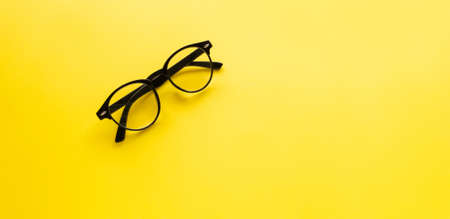 Black framed eyeglasses on yellow table. Top view