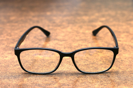 Old dirty black glasses on the desk. It is used to see nearby.