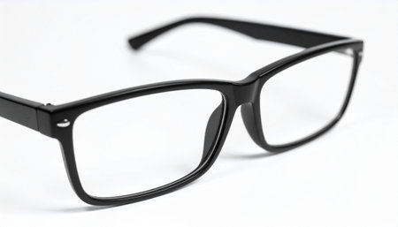 Close-up of black plastic eyeglasses with clear lenses on a plain white surface