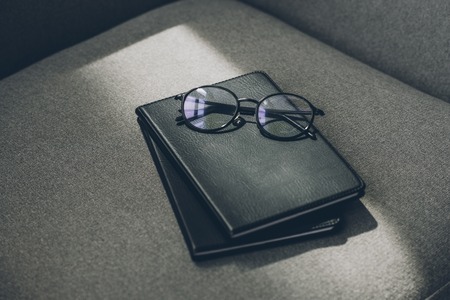 eyeglasses and two notebooks on grey armchair in office