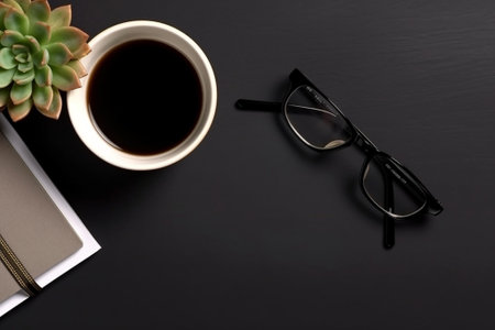 Flat lay eyeglasses smartphone wireless headphones black pen open notebook and cup of coffee on wooden background : Generative AI