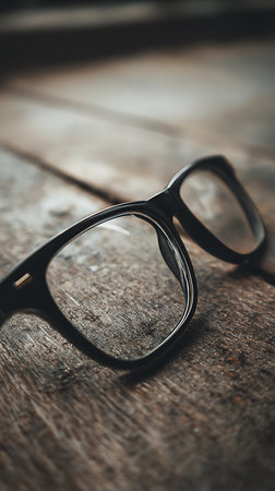 Classic black frame eyeglasses with clear lenses resting on a rustic wooden table. soft light highlights the texture of the wood and the sleek design of the eyewear, suggesting a moment of pause or study.