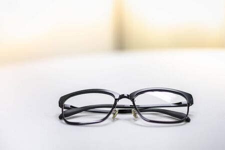 Close up of used reading glasses on white table with copy space for text.