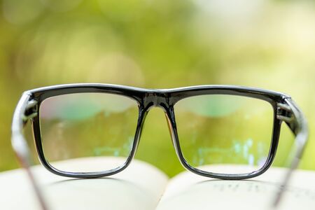 Close up book and eye glasses on wooden table with abstract green nature blur