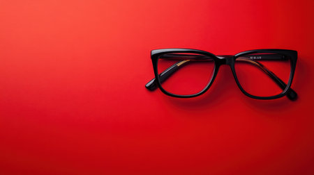 A pair of black eyeglasses rests elegantly on a bold red background, showcasing modern design and style, ideal for fashion and optical-themed projects.