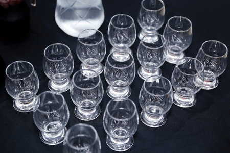Glassware selection with wine, champagne and liquour glasses on the dark background.. Fine cristal glassware concept. Horizontal