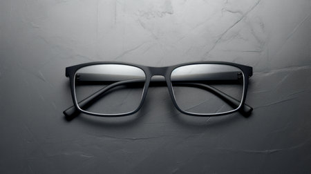 black rimmed glasses, shaped like classic spectacles, are showcased against a sleek grey concrete backdrop. this photo features a realistic and hyper-detailed rendering style, highlighting the intricate details of the glasses. the use of innovative techniques such as tenwave, back button focus, clean and sharp inking, and rectangular fields adds to the overall visual appeal. the glasses resemble the iconic yashica t4 design. ai generated