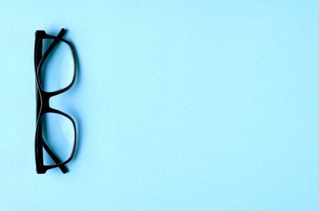 Black glasses on blue background composition, eyeglasses. Flat lay and top view photo