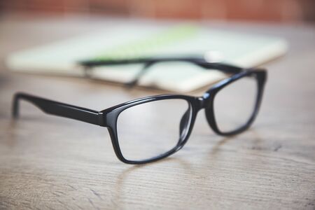 glasses and notebook on wooden table education school office business