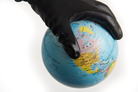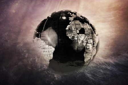 A single spotlight illuminates a classic world globe, casting deep shadows and highlighting the continents.