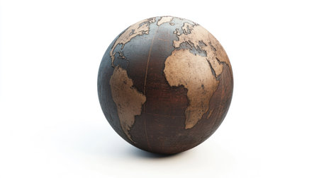 A close-up shot of a wooden globe, highlighting the intricate details of the continents and the texture of the wood, set against a clean background.