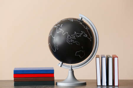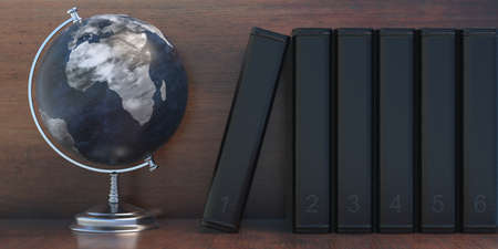 Globe planet Earth and School books on wooden library shelf, world map sphere model on metal stand, student room background. Geography class, education. Cartography. 3d illustration
