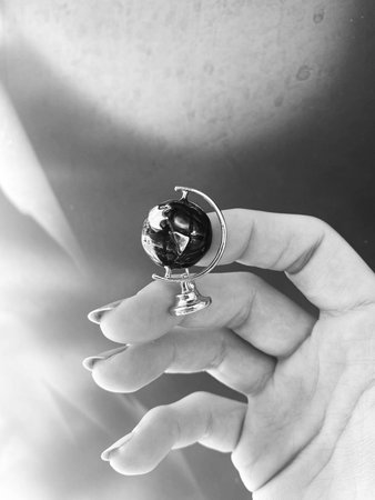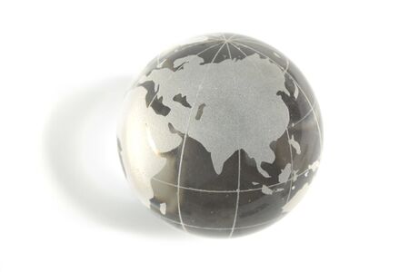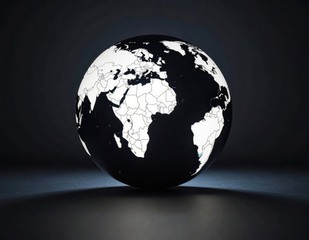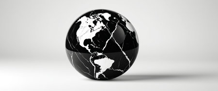 A black and white globe rotates gently, displaying the continents in an artistic manner, set against a clean, minimalist backdrop.