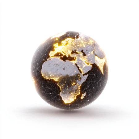 A striking digital representation of a globe featuring illuminated geographical areas of Europe and Africa. The glowing networks symbolize connectivity and technology.