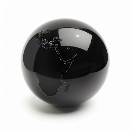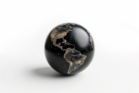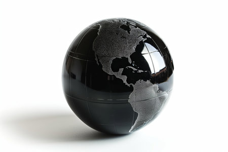 A grayscale illustration features a detailed globe of Earth. The composition showcases a high-contrast aesthetic with a central, illuminated sphere set against a dark backdrop. Suitable for various applications, it conveys themes of global connectivity, environmental awareness, and worldwide systems.