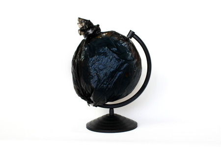 A globe of the earth in a plastic black bag like trash over white background, the concept of ecology problem and World Environment Day. Photo with message for social advertising, place for inscription