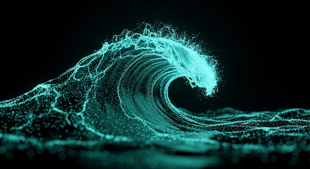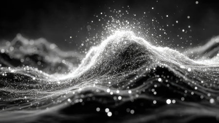 A dynamic composition presents a flowing wave in shades of blue and white, adorned with shimmering particles. The image is set against a deep black background, enhancing the contrast and visual impact. Ideal for a range of creative projects including advertising and design, this image offers versatility.