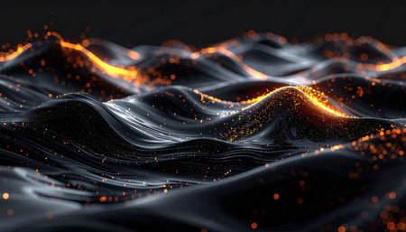 With showing golden glowing wavy energy stream with sparkling particles flowing across a dark reflective surface and...