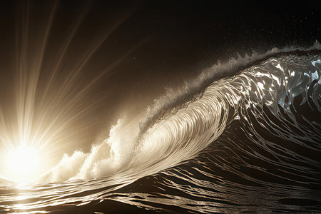 Powerful ocean wave cresting and curling with sunlight illuminating the water and creating a dramatic dark effect.
