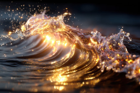 Rippling waves create an elegant composition of glossy textures and sparkling reflections. The ambient light enhances the fluid's allure, creating a tranquil atmosphere.