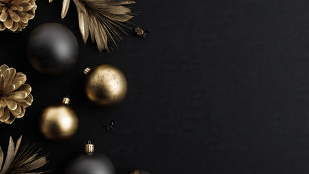 Background with a Christmas balls. Luxury festive black and golden flat lay with a copy space. AI generative