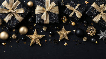 Discover an elegant arrangement of black and gold holiday gifts, perfect for showcasing festive celebrations. This sophisticated composition offers ample space for text and design elements.