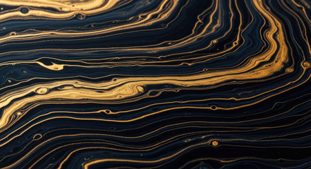Alcohol ink painting abstract background in gold and black colors, swashes, splashes and bubbles rich layered hand drawn texture, golden glitter veins, AI generated image