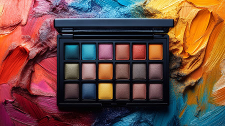 An open eye shadow palette with vibrant colors, surrounded by brush strokes on a white background