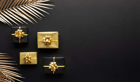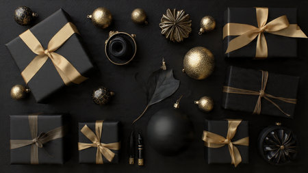 Gold-wrapped gifts and ornaments arranged on a clean matte-black flatlay scene.