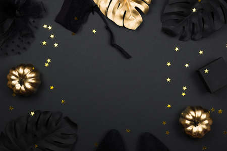 Halloween party collection female outfit accessories on black background: hat with veil, garter belt, gifts. Black and gold pumpkins, flat lay, top view, copy space.