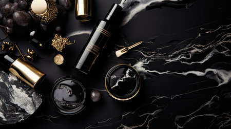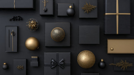 High-end gold decorations arranged elegantly on a matte-black canvas.
