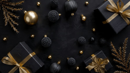 A sophisticated matte-black holiday scene enhanced with glowing pure-gold ornaments and premium gift styling.