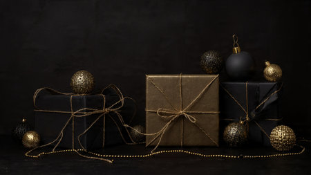 Christmas or New Year background with black gift, Christmas baubles over black background. black friday Greeting card. Copy space.