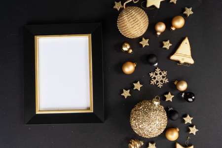 Golden christmas decorations with gingerbread cookies over black background, copy space on modern frame