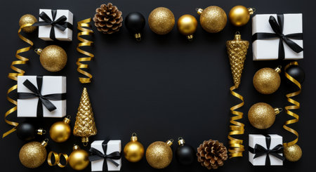 Elegant black and gold Christmas arrangement with baubles, pine cones, ribbons, and gift boxes on dark background, festive concept.