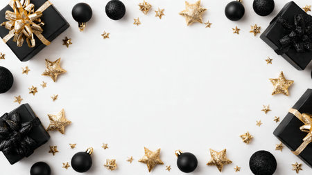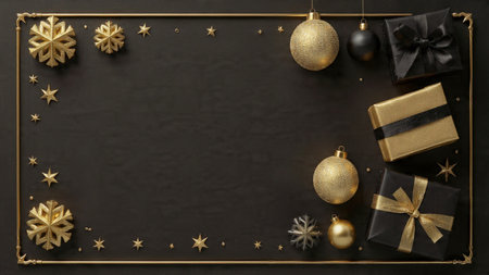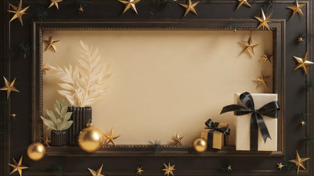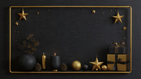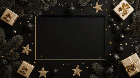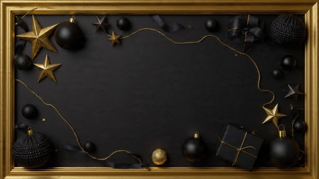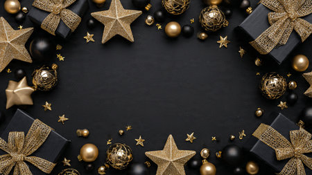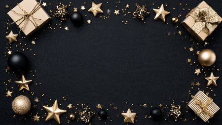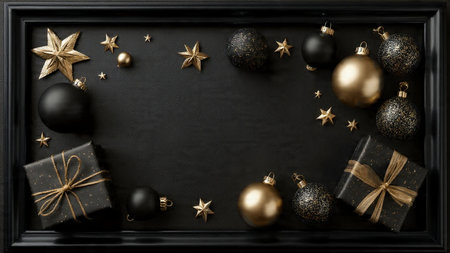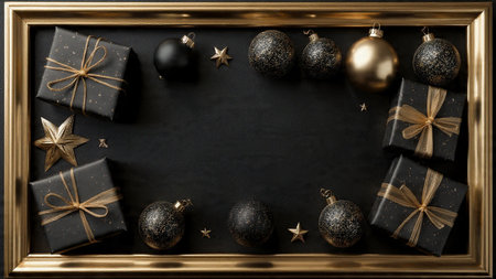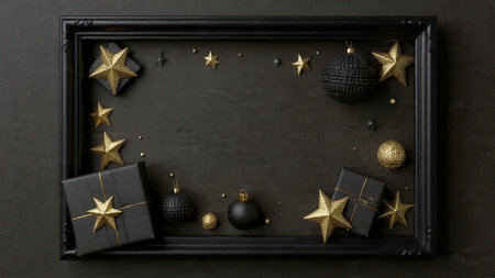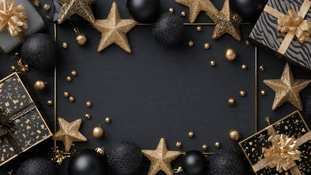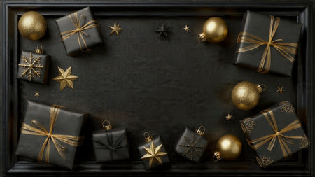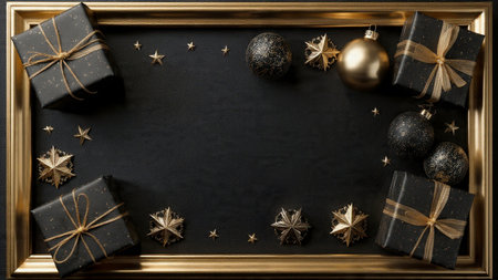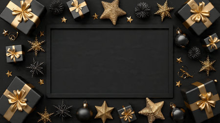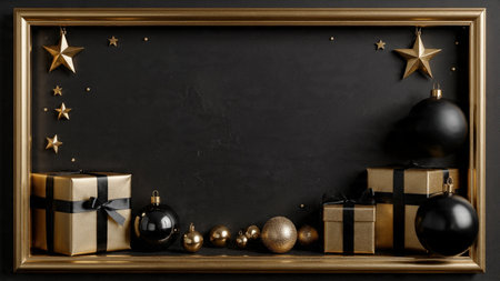 A stylish matte-black frame decorated with gold stars and high-end wrapped gifts.