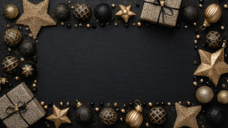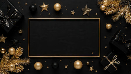 new year and christmas black background and gold decorations. background for text in a frame for a party