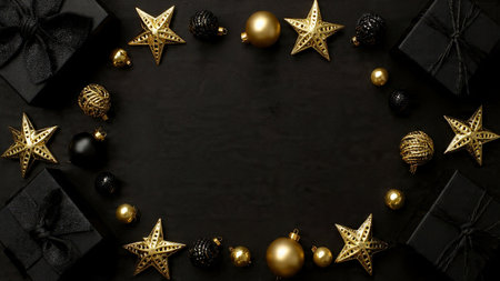 Elegant gold ornaments rest gracefully on a deep black festive background.