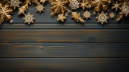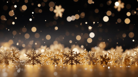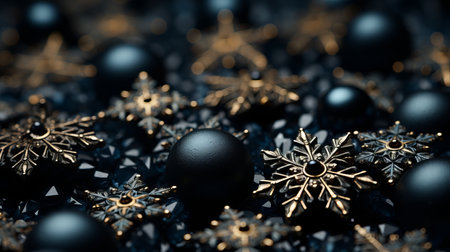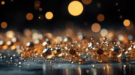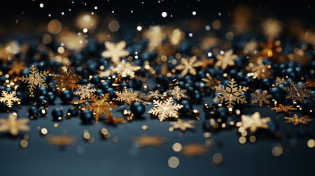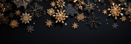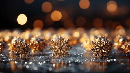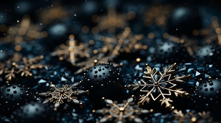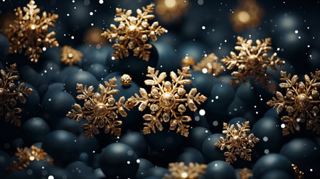Scattered golden snowflakes adorn a dark background, creating a visually appealing composition. The lighting highlights the intricate details of each decoration. This image could be used for various projects, including holiday-themed advertising, greeting cards, or decorative designs, providing a touch of elegance and seasonal charm.