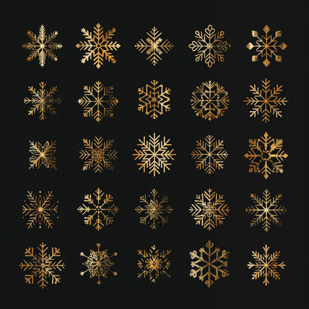 A stunning arrangement of golden snowflakes on a deep black background, perfect for winter designs, holiday themes, and elegant seasonal decorations.