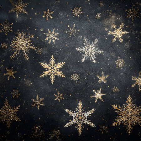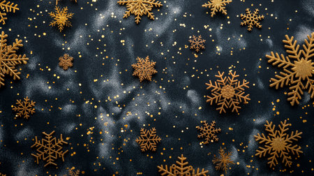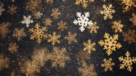 Golden snowflakes on a dark background, creating a sparkling, festive winter holiday design