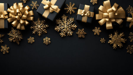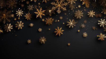 A captivating arrangement of golden snowflakes covers a dark background, creating a festive and elegant atmosphere. Golden luxury snowflakes on dark background, Christmas, new year, winter holidays. Generative AI