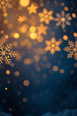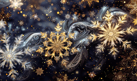 Glamorous winter background with intricate gold and navy snowflakes shining brightly