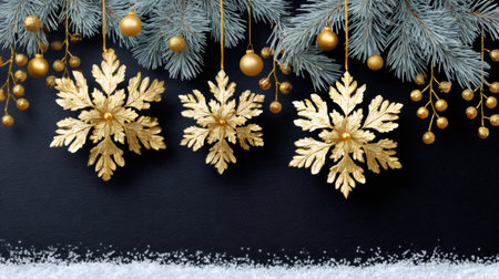 Christmas background with golden snowflakes and fir branches hanging over black background and snow